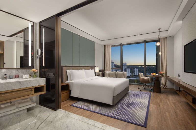 JINYUN POETRY HOTEL, a high-end hotel under the "Ting" series brand newly interpreted by Zhejiang Wandi Tourism Group, is located in Jinyun County, Lishui City, renowned as "the fairyland on earth". Boasting a prime location, JINYUN POETRY HOTEL is situated at the intersection of Dinghu South Road and Haoxi Road in Jinyun County, with a total of 415 parking spaces (including 52 charging spaces underground), fully ensuring free parking and electric vehicle charging needs for in-house guests. It is within walking distance to Jinyun Station, Binjiang Park, and Jinyun Museum; adjacent to Xiandu Scenic Area (a national 5A-level scenic spot), and only a 15-minute drive from Xiandu Temple and Jinyun West High-Speed Rail Station. The hotel's design concept draws on the unique cultural heritage of Jinyun County, blending it with natural landscapes, aiming to create a charming gem that blends modern luxury with local culture for guests.JINYUN POETRY HOTEL features 542 guest rooms, all designed with panoramic floor-to-ceiling windows for a wide view, allowing you to enjoy the city's beautiful scenery from your room. The rooms are equipped with TOTO and DURAVIT sanitary facilities, American King Koil mattresses, 60-inch Sharp 4K LCD TVs, and Carnation high-end linens, creating a Baoting Heavenly Dream Bed; on the left side of the hotel, beside the Dinghu Bridge, the waves are rippling and the breeze is blowing gently. The Wandi Plaza commercial complex on the right side of Lishui Jinyun Baoting Hotel is brightly lit and vibrant. JINYUN POETRY HOTEL boasts a 2000-square-meter, 8-meter-high pillar-free Baoting banquet hall, 12 multi-functional banquet and conference rooms, meeting the needs of large wedding banquets, exhibitions, and business meetings in a one-stop manner. In addition, there are 300-seat all-you-can-eat restaurants, 14 Chinese food private rooms, and a lobby bar, gym, and indoor heated swimming pool, providing guests with diverse choices. Jinyun Baoting Hotel is committed to the service vision of "arriving in Jinyun, staying at Baoting, making every encounter worthwhile", striving to create a pleasant and memorable stay experience for guests. JINYUN POETRY HOTEL warmly welcomes your visit!
